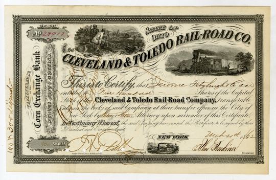 Ohio, 1863. 500 Shares Capital Stock I/C Certificate, Black on black border, Multiple train vignettes at top and bottom and survey vignette at top, Cut cancelled and hand written cancelled, VF-XF condition, Snyder, Black & Sturn.