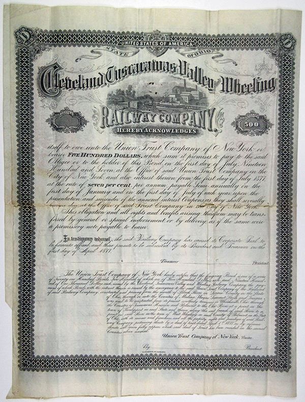 Ohio. $500 Specimen/Unissued 7% First Mortgage on Southern & Second on Northern Division Coupon Bond, Black text with black border, no undertint, with small illustration of train passing through tunnel at top. Fine condition with prominent splitting along middle fold and flaking along margins and archivally reinforced folds. Unique as a bond in Cox, Rare unlisted denomination. W.J. Morgan & Co., Lith, Cleveland.