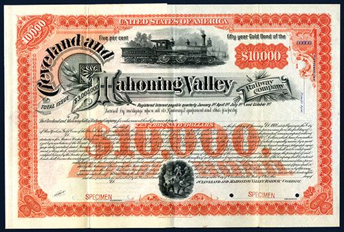 Ohio, 1888, $10000, 5% 50 Year Gold Specimen Bond, Black on orange border and underprint, Locomotive l-r top center with mining vignette center bottom, VF condition, ABNC. Unlisted bond in Cox.
