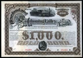 Ohio. 1888, $1,000. 5% 50-year Gold Bond, Ornate Brown border with locomotive L-R and miners on bottom with ornate title, ABNCo. specimen, POC's, VF, Very attractive bond that is listed as railroad but not as a bond in Cox.