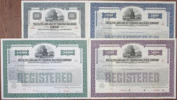 Ohio and Pennsylvania. Lot includes 4 specimen bonds all with Gold Clause stating the U.S. was leaving the Gold standard and that all debts were payable in legal tender, includes: $1000 Specimen 4.5% General and Refunding Mortgage Gold Coupon Bond in blue; $5000 Specimen 4.5% Registered General and Refunding Mortgage Gold Bond in purple; $1000 Specimen 4.5% Registered General and Refunding Gold Bond in blue; $10,000 Specimen 4.5% Registered General and Refunding Gold Bond in green. All have specimen overprints, 0000 serial numbers and POCs. VF to XF condition. Rare with Gold Clause. 4 pieces.