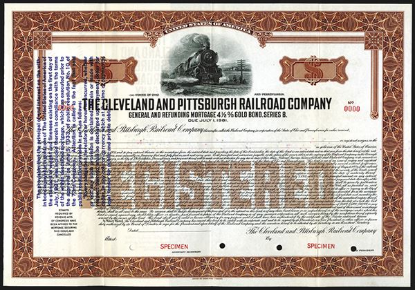 Pennsylvania and Ohio. 19xx (ca.1933-40). $-Odd, Registered General and Refunding Mortgage 4 1/2% Gold Bond, Series B. Brown border and underprint. Train passing track workers and telephone poles. ABNCo. Specimen, XF. Rare legend added to bond to inform the buyer that the Gold clause has been changed and the bond is payable in legal tender only, not gold. This Historic clause has been found on only a handful of certificates.