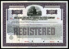 Pennsylvania and Ohio. 19xx (ca.1933-40). $5,000 Registered General and Refunding Mortgage 4 1/2% Gold Bond, Series B. Purple border and underprint. Train passing track workers and telephone poles. ABNCo. Specimen, XF. Rare legend added to bond to inform the buyer that the Gold clause has been changed and the bond is payable in legal tender only, not gold. This Historic clause has been found on only a handful of certificates.