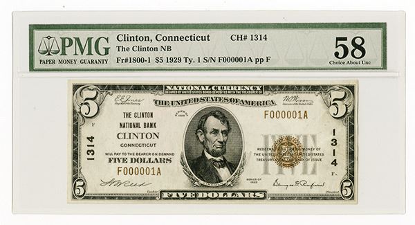 Clinton, CT., $5, 1929 Ty 1, Fr#1800-1, Ch.# 1314, F000001A, PMG graded Choice About Uncirculated 58.
