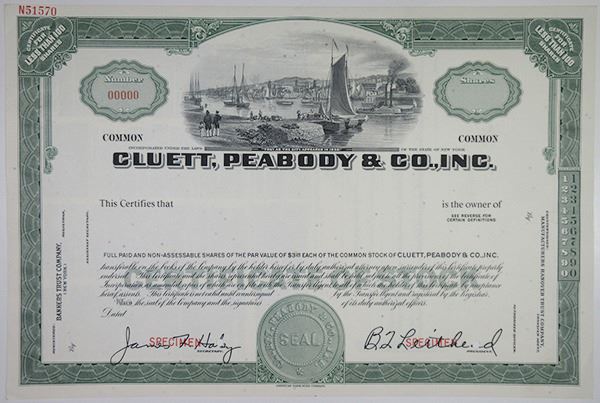 New York, ND (1940s). <100 Shares Specimen Stock Certificate, Black text with green border and underprint, Scene at top center of a harbor busy with ships and commerce. Red specimen overprints, "00000" serial number, POC's, VF condition, Printed by ABNC. Cluett Peabody & Company, Inc. once headquartered in Troy, New York, was a longtime manufacturer of shirts, detachable shirt cuffs and collars, and related apparel. It is best known for its Arrow brand collars and shirts and the related Arrow Collar Man advertisements.