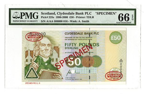 Scotland, specimen 50 Pounds, P-225s, PMG graded Gem Uncirculated 66 EPQ, Specimen No. 016.