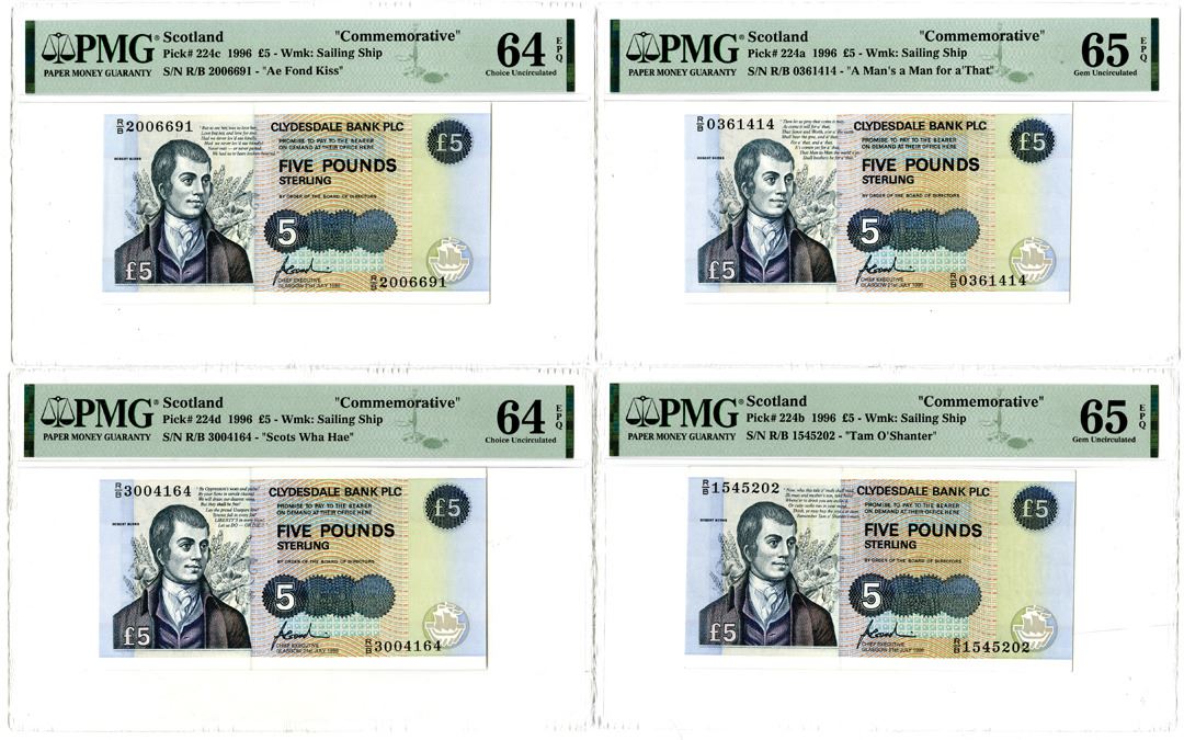 Scotland, 1996. Quartet of Commemorative Robert Burns Poetry 5 Pounds, P-224a, P-224b, P-224c, P-224d, Issued Banknotes. Black and gray on m/c underprint with Burns at left. All notes are PMG graded: 224a and 224b are Gem Uncirculated 65 EPQ and 224c and 224d are Choice Uncirculated 64 EPQ. (4).
