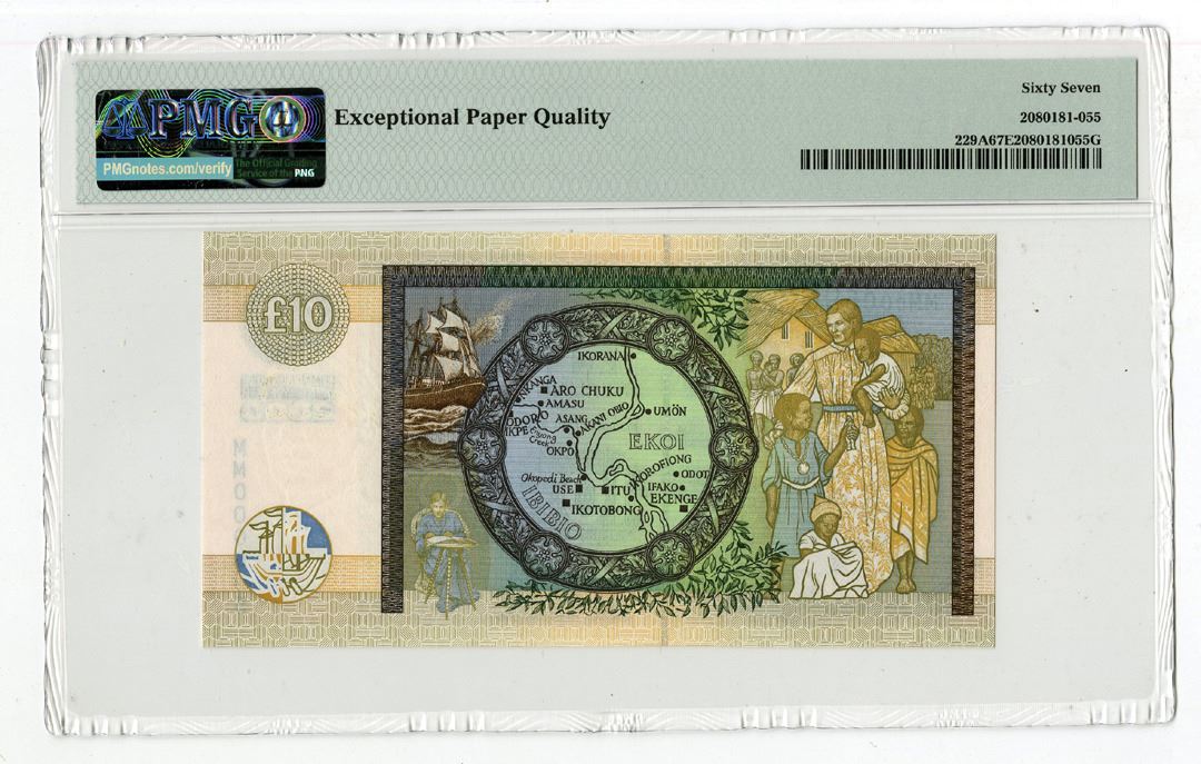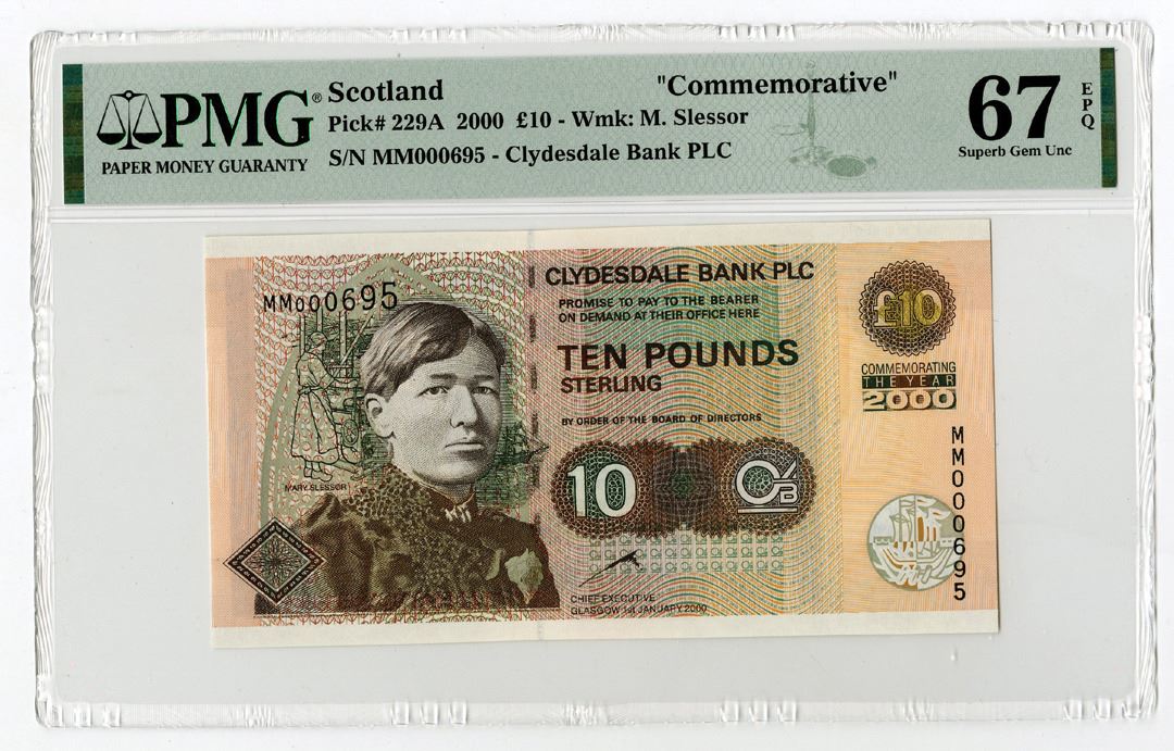 Scotland, 2000. 10 Pounds, P-229A Issued Banknote. Dark brown on m/c underprint with Mary Slessor at left. S/N MM000695. PMG graded Superb Gem Uncirculated 67 EPQ. 1 note grades higher in the PMG census out of 25 notes graded.