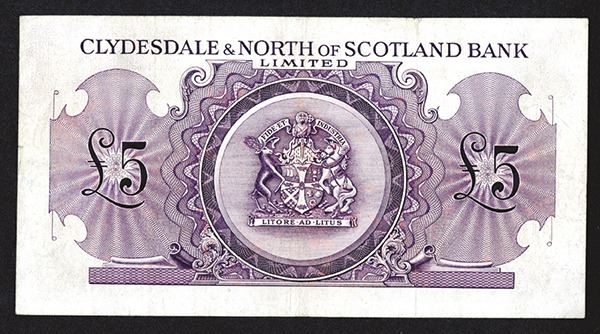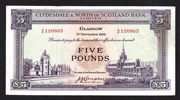Scotland. 5 Pounds. P-313a. 1.11.1956. Churches at left and right bottom; arms on back. Very Fine.