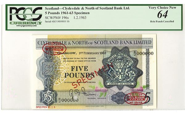 Scotland. 1963, 5 Pounds, P-196s Unlisted as a Specimen in SCWPM, Specimen and Oval TDLR overprints on top left and lower right corners, Minor Mounting remnants on back right margin that is difficult to view. PCGS graded Very Choice New 64, POC, TDLR.