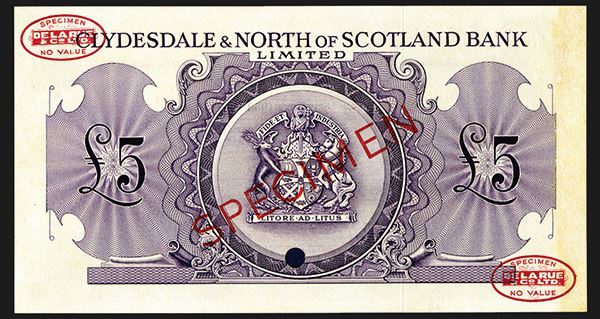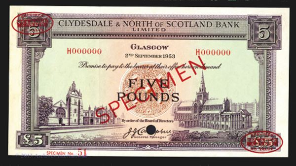Scotland. Pick #192a for type. Unlisted Specimen. DeLaRue ovals in corners, number in lower left. Punch hole cancel on signature. Back right edge with paper tone from former mounting. Scarce. PMG graded Choice Uncirculated 64 NET with note of previously mounted.