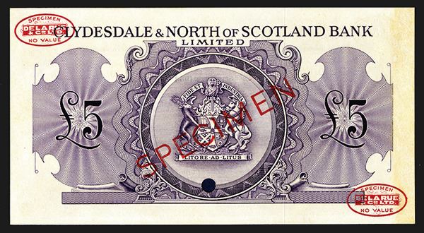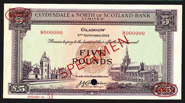 Scotland. Pick #192a for type. Unlisted Specimen. DeLaRue ovals in corners, number in lower left. Punch hole cancel on signature. Back right edge with paper tone from former mounting. Scarce. PMG graded Choice Uncirculated 64 NET with note of previously mounted.