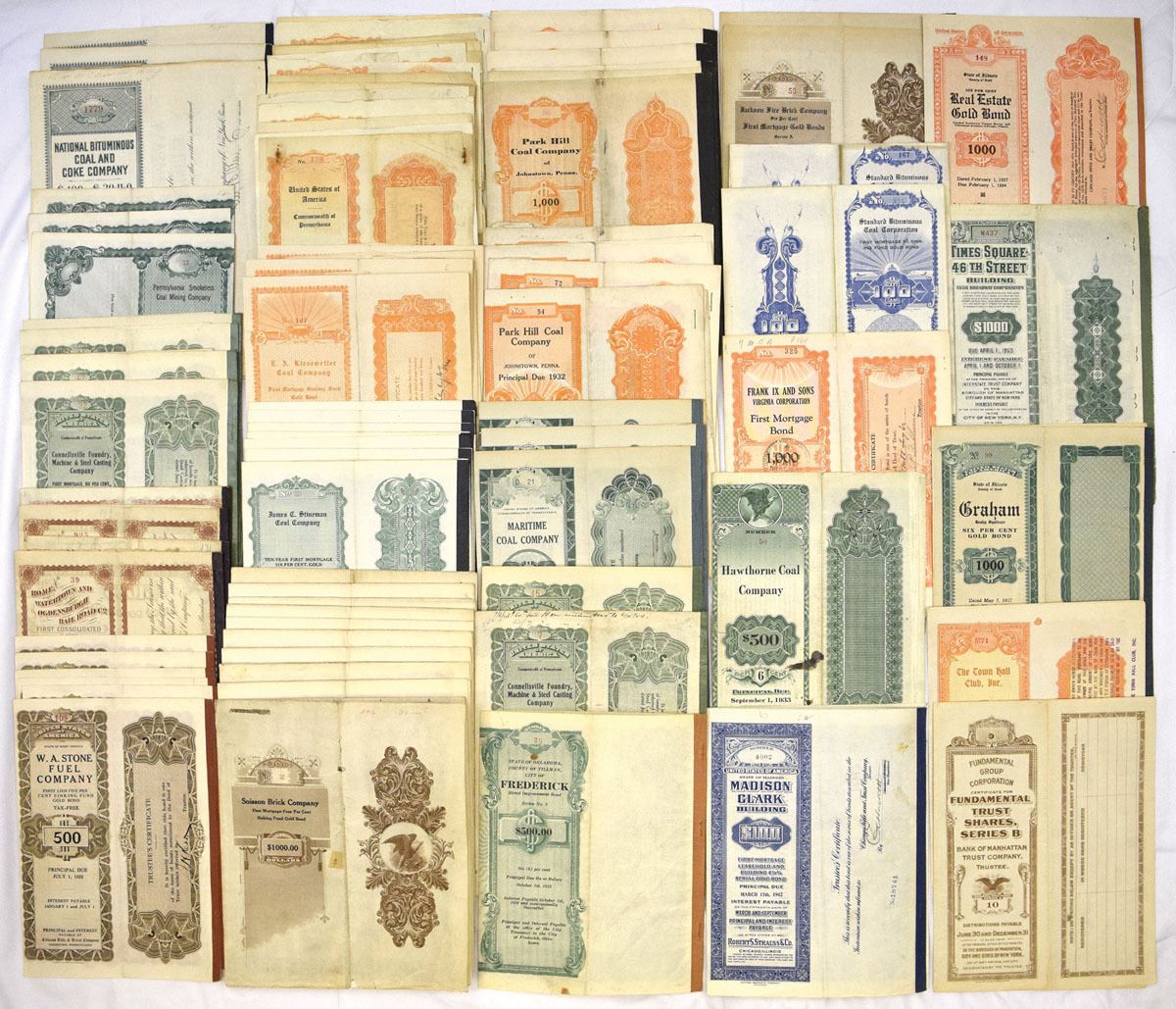 Various States, 1890-1930s. Lot of 86 Issued bonds and certificates representing coal companies, industrial concerns, utilities, and real estate interests. Includes examples from National Bituminous Coal and Coke Company; Park Hill Coal Company of Johnstown, Pennsylvania; Hawthorne Coal Company; Maritime Coal Company; Standard Bituminous Coal Corporation; Pennsylvania Smokeless Coal Mining Company; Connellsville Foundry, Machine & Steel Casting Company; Madison Clark Building; Times Square–46th Street Building; Frank IV and Sons (Virginia Corporation); Graham; Frederick; W.A. Stone Fuel Company; Fundamental Trust Shares, Series B; and other similar issuers, among others. Mix of denominations and formats, featuring engraved designs, decorative borders, and varied vignette styles typical of the period. Conditions range from Good to Very Fine overall. (86). Sold “AS IS” no returns accepted.