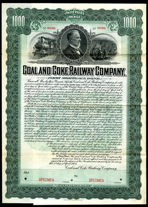 Coal and Coke Railway Co., 1904 Specimen 1st Mortgage 5% Gold Coupon Bond. West Virginia, $1000 Specimen Bond, Black on green border and underprint, Portrait of H.G.David in middle top flanked by locomotive and miners, Specimen overprints, POC;s, VF to XF condition. ABNC. One of 4 certificates found of this variety. Only known as specimen in Cox.