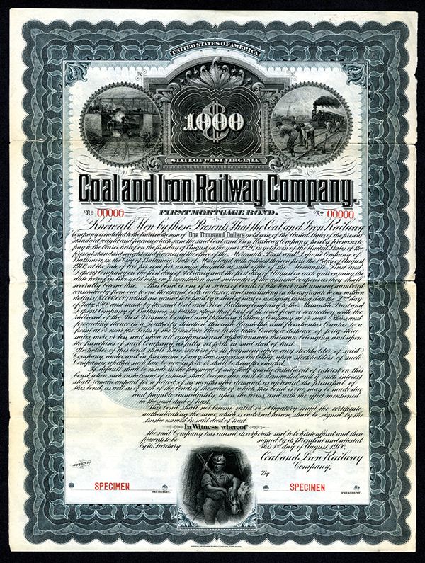 Coal and Iron Railway Co., 1900 Specimen Bond. West Virginia. 1890, $1000 Specimen 1st Mortgage 5% Gold Coupon Bond, Black on green border and underprint Denomination medallion flanked by train under bridge and men working by tracks with miner at bottom, Fine to VF with minor edge splits. The railroad is known but no previous examples have been found by Cox up to this point. One of 2 found in the archives. ABNC.