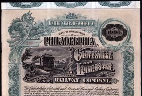 Pennsylvania, 1904, $1,000 Issued bond, 5% first mortgage 30 year gold bond. Green border with interurban train passing man and dog on left with ornate title vignette, SBNC, Philadelphia with coupons, VF. Scarce and attractive.
