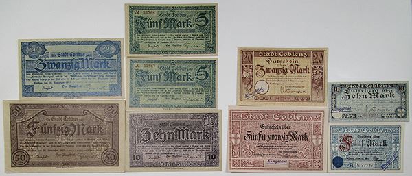 Germany. Lot includes 9 notes from Coblenz a quartet of 5, 10, 20, and 25 Mark Notgeld; and from Cottbus a quintet of 5, 10, 20, and 50 Mark Notgeld. Generally XF to Unc. (9)