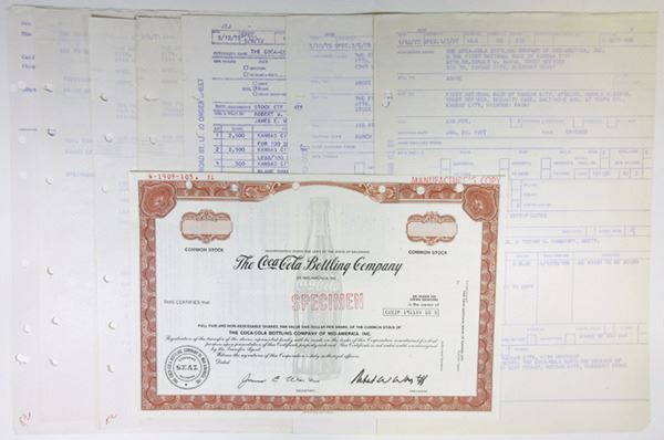 Odd Shares, Common Stock Specimen Certificate, Black print on brown border with famous glass bottle of Coke as under tint, Manufacturing Copy stamp at top, XF condition, ABNC. Included are order forms for varying quantities and colors of the sample certificate. Very interesting lot and rare lot.