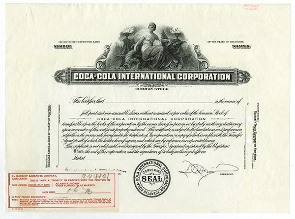 Georgia. ca.1930-40's. <100 Shs. Common stock, orange border. Class "A" stock. Seated allegorical woman with one hand on cornucopia with coins falling out and the other hand on winged wheel. Rare Coca-Cola related certificate. Choice uncirculated. RBNC.