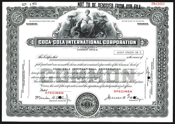 Seated allegorical woman with one hand on cornucopia with coins falling out and the other hand on winged wheel. Rare Coca-cola related certificate. Choice uncirculated. SCBNC.