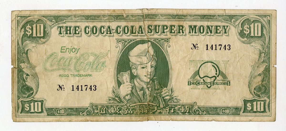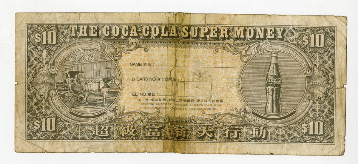 Hong Kong, and Taiwan. A lottery ticket issued by a Coca-Cola branch in the greater China area, presumably in Hong Kong or Taiwan. The front side depicts a boy drinking Coca-Cola with cash in his hand. The design is very similar to a US dollar bill. Serial number is 141743. The back side shows a cart and a bottle of Coca-Cola, as well as entries for customer name, ID card number and phone number. ___________________________________________________141743.____________________________