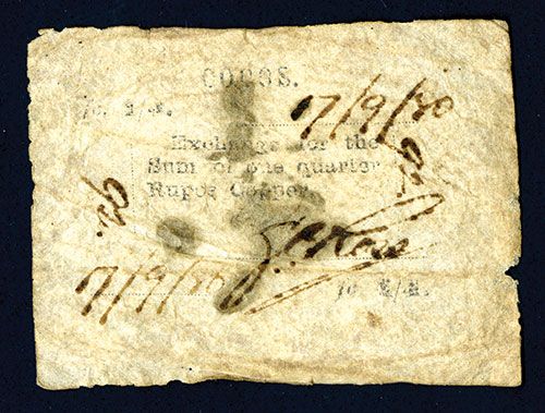 Keelings Cocos, September 7, 1880, fc. 1/4 Rupee Copper, P-Unlisted earlier date 1880, Listed in SCWPM dating from 1887 to 1888, Black printing, Large Size, 65 x 49 mm, Printed on thin parchment, Hand signed by J.C. Ross, embossed seal at center top, S/N 92, VG to VG+ condition. Amazing note with most examples from the 1887 time period usually with significant ink burn, this unlisted earlier issue has no ink burn. The later 1887-88 Issue is unpriced in SCWPM and this unlisted earlier issue should attract considerable interest. The Keeling Cocos Islands are a group of 27 small coral islands located in the Indian Ocean, first discovered in 1609. In 1857 they became a British Protectorate and were administered by the Clunies-Ross family until the islands were sold to Australia in 1978. Rare and desirable note possibly never offered before at public auction.