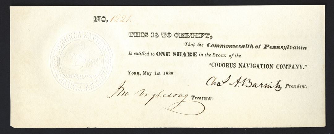 York, Pennsylvania.....1 Share, I/U, Small banknote size certificate, black print on off white paper, Ornate embossed seal at left with horse pulling canal barge. VF-XF. Rare and early navigation company. Signed by Charles A. Barnitz as company president. Charles Augustus Barnitz (September 11, 1780 Ð January 8, 1850) was an American politician who served as an Anti-Masonic member of the U.S. House of Representatives for Pennsylvania's 11th congressional district from 1833 to 1835. (John E. Herzog Collection)