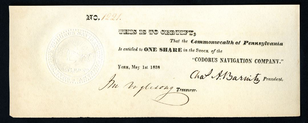 York, Pennsylvania.1 Share, I/U, Small banknote size certificate, black print on off white paper, Ornate embossed seal at left with horse pulling canal barge. VF-XF. Rare and early navigation company. Signed by Charles A. Barnitz as company president. Charles Augustus Barnitz (September 11, 1780 Ð January 8, 1850) was an American politician who served as an Anti-Masonic member of the U.S. House of Representatives for Pennsylvania's 11th congressional district from 1833 to 1835. (John E. Herzog Collection)