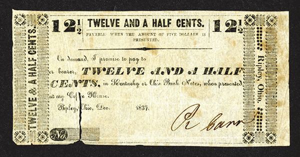 Ohio. 12-1/2 cents. Wolka 2331-02. Signed, unnumbered. Some paper tone. Paper separation at lower left. Fine.