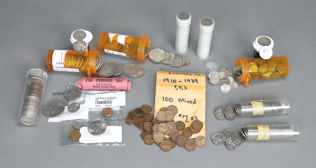 interesting lot of mostly 90% silver dimes, quarters and half dollars; includes Barber halves, quarters, Mercury Dimes, Walking Liberty, Franklin and Kennedy halves, a partial roll of circulated Buffalo nickels, many with full dates; a small bag of 1910-39 Lincoln cents unsearched as well as two rolls of Jefferson nickels; total 90% silver face value is over $50; unsearched for better dates or types (silver melt value over $1000). Shipping charges apply - weight 6.6 lbs. (photo on web site)