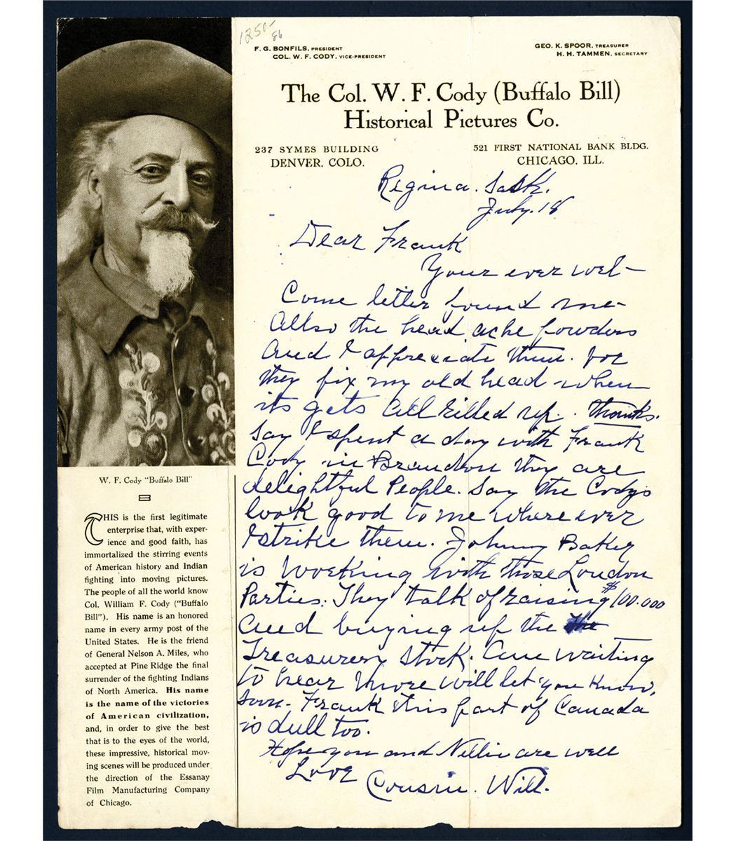 Full page, Quarto, July 18 (ca.1916), Letter signed Cousin Will in Cody's hand, Letter discusses raising money to buy up the treasury stock as well as "...Spent the day with Frank Cody in Brandon...the Cody's look good wherever I strike them". Letterhead has Cody's photograph on the left as well as comments by the film company, Cody was an American Soldier, bison hunter where he got his nick name "Buffalo Bill" and showman. He rode for the Pony Express, He won the Medal of Honor for his service as a scout, but he became famous for the cowboy shows he organized and toured the world with. Historic autograph.