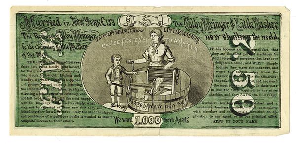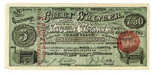 This is a colorful ad note for Colby Wringer Company which dissolved when its charter expired in 1878. The wringer sold for $7.50 and the washer sold for $5. A great period vignette is found on the back. Extremely Fine condition.