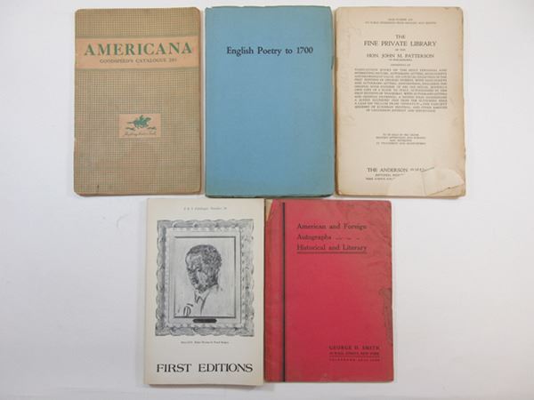 5 Pieces. American and Foreign Autographs, Public Auction of the Fine Private Library of the Hon. John M. Patterson of Philadelphia, Americana Goodspeed's Catalogue, English Poetry to 1700, and J & S Catalogue of First Editions. All are ranging from Fine-XF in condition.