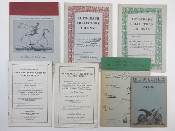 7 Pieces. Life in Letters 1939, 2 Catalogues of Original Autographs of Famous People, 4 Catalogues of Autograph Collectors' Journal July 1950, October 1950, April 1951, and Fall 1952. All are in VF-XF condition.