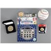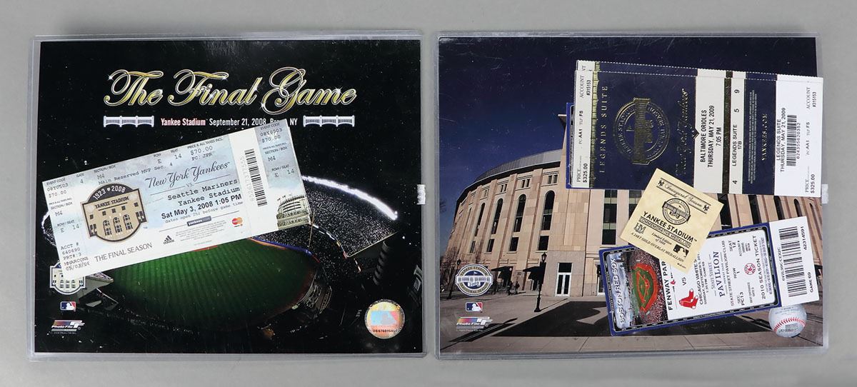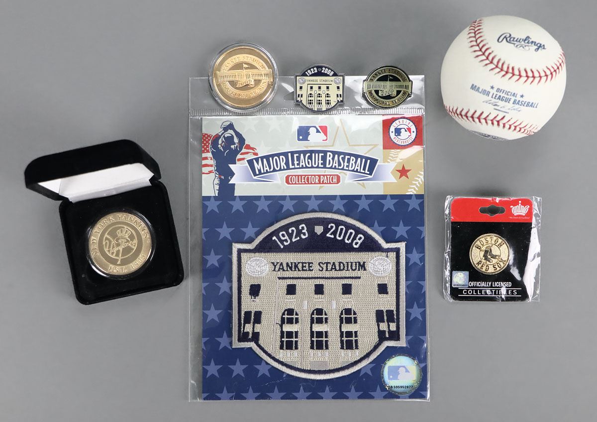 group includes MLB licensed photos of Yankee Stadium, tickets from the final season in the original Yankee Stadium, tickets from the Inaugural Season in the new Yankee Stadium, pins, coins, a commemorative Yankees patch, a commemoraitve Yankees Baseball from the Inaugural Season, and more; see images of the lot. (photo on web site)