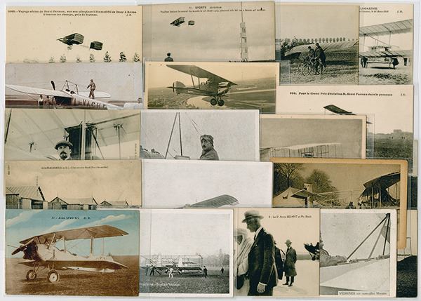 Group of 19 original French postcards featuring pilots and airplanes. Highlights include photos of Jules VŽdrines, Henri Farman airplanes in flight and at rest, the experimental aircraft Antoinette VI, as well as a picture of Albert Kimmerling, a pioneer aviator who made the first airplane flight in Africa, taking off at the Nahoon Racetrack at East London, South Africa on 28 December 1909 in a Voisin biplane. All are in VF condition with minor pencil marks.