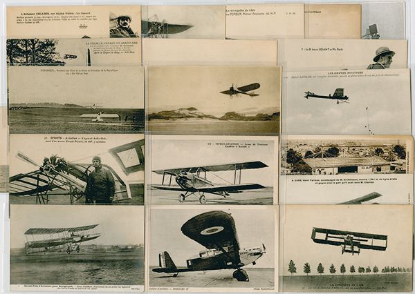 Group of 19 original French postcards related to early airplanes and military aircrafts, as well as pilots. Featured pilots include Maurice Colliex, Henri Farman, and Hubert Latham, who was the first person to attempt to cross the English Channel in an aeroplane. Due to engine failure during his first of two attempts to cross the Channel, he became the first person to land an aeroplane on a body of water. All postcards are in VF condition with minor pencil markings on several.