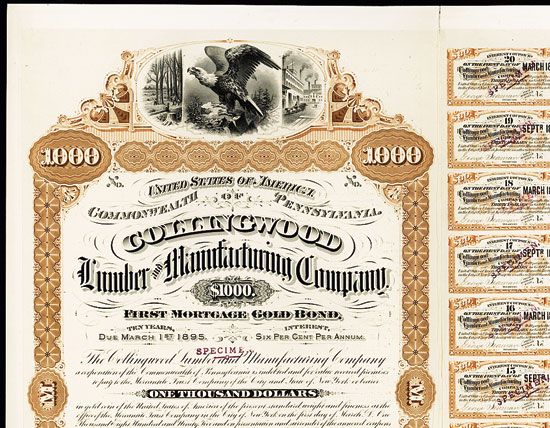 Pennsylvania, 1885, $1000, 6% 1st Mortagage Gold Proof Bond mounted on white thick paper, Black on brown border and underprint, Bald Eagle vignette top center flanked on right by Industrial buildings and left by men logging, Coupons attached with purple SPECIMEN overprints, VF-XF condition, HBNC.