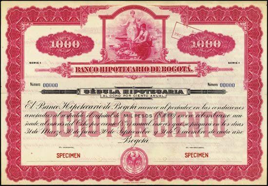 Bagota, Colombia. 3 different Specimen bonds. ND and 19-- (ca.1900-1940's). 100 Pesos, 8% Bond, orange; 500 Pesos, 10% Bond, blue; 1000 Pesos, 8% Bond, fluorescent pink. All with one topless and one dressed allegorical women. Red SPECIMEN overprints and POC's. Coupons attached. VF condition. ABNC.