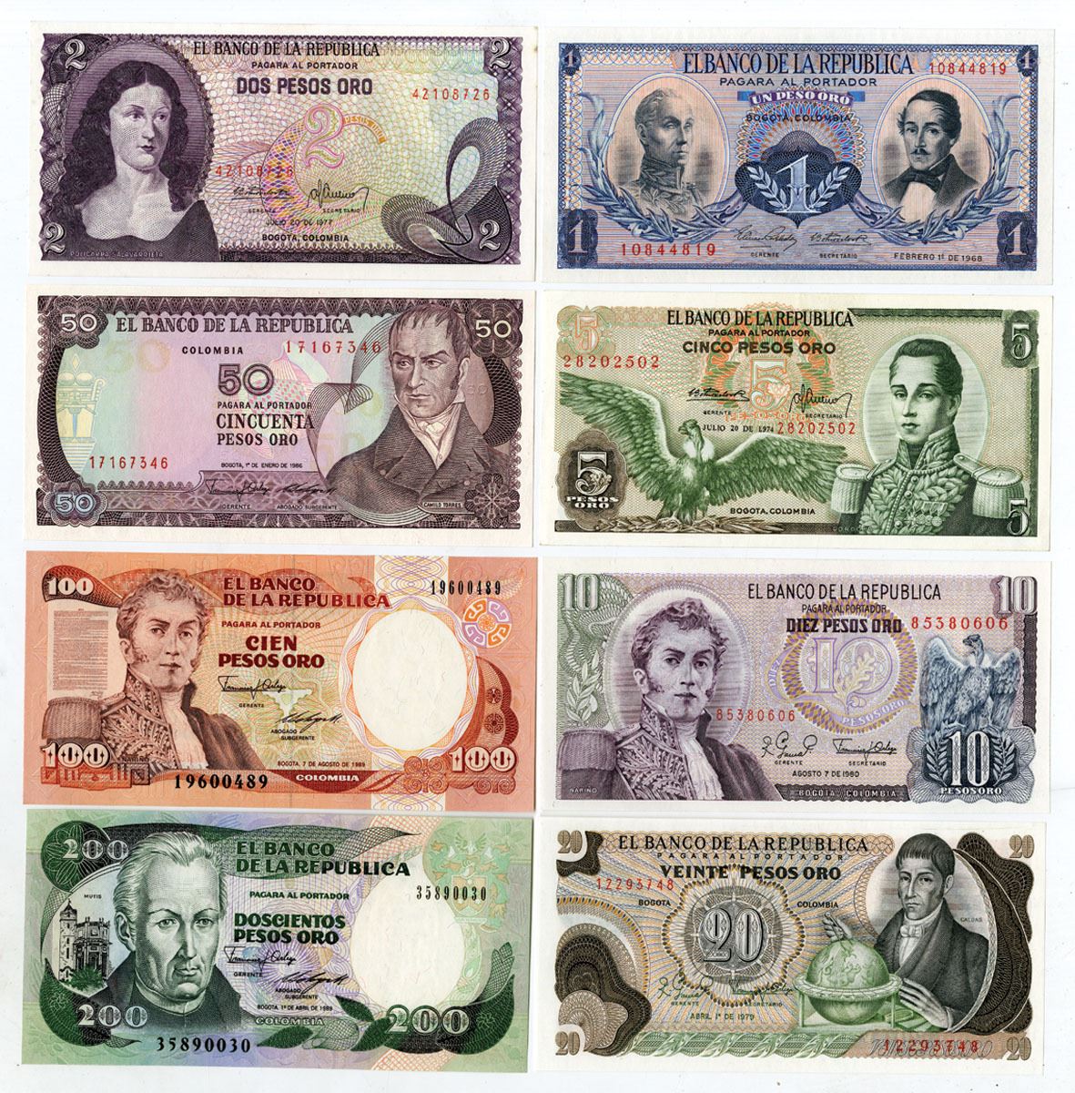 Colombia, 1968 to 1989.... Lot of 8 Issued Banknotes, Includes: 1 Peso Oro, P-404d, IdBB; 5 Pesos Oro, P-406e; 10 Pesos Oro, P-407g; 20 Pesos Oro, P-409d; 2 Pesos Oro, P-413b; 50 Pesos Oro, P-414, TDLR; 100 Pesos Oro, P-426d, IBB; 200 Pesos Oro, P-429d, TDLR. Banknotes range from Uncirculated to Gem Unc condition. (8). Sold "AS IS" no returns accepted.