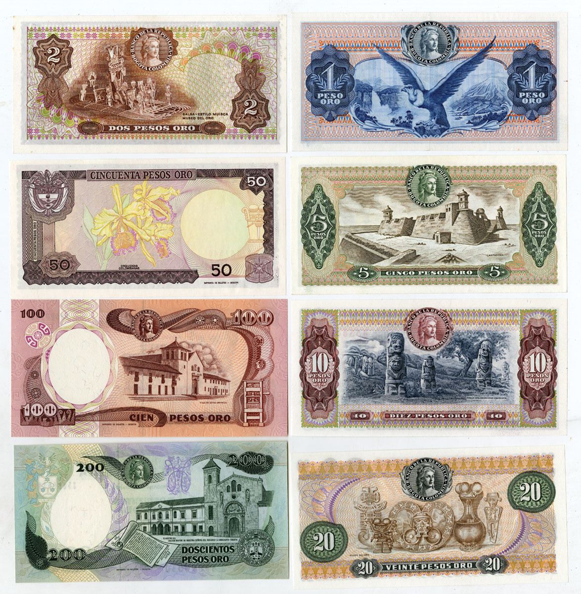 Colombia, 1968 to 1989.... Lot of 8 Issued Banknotes, Includes: 1 Peso Oro, P-404d, IdBB; 5 Pesos Oro, P-406e; 10 Pesos Oro, P-407g; 20 Pesos Oro, P-409d; 2 Pesos Oro, P-413b; 50 Pesos Oro, P-414, TDLR; 100 Pesos Oro, P-426d, IBB; 200 Pesos Oro, P-429d, TDLR. Banknotes range from Uncirculated to Gem Unc condition. (8). Sold "AS IS" no returns accepted.
