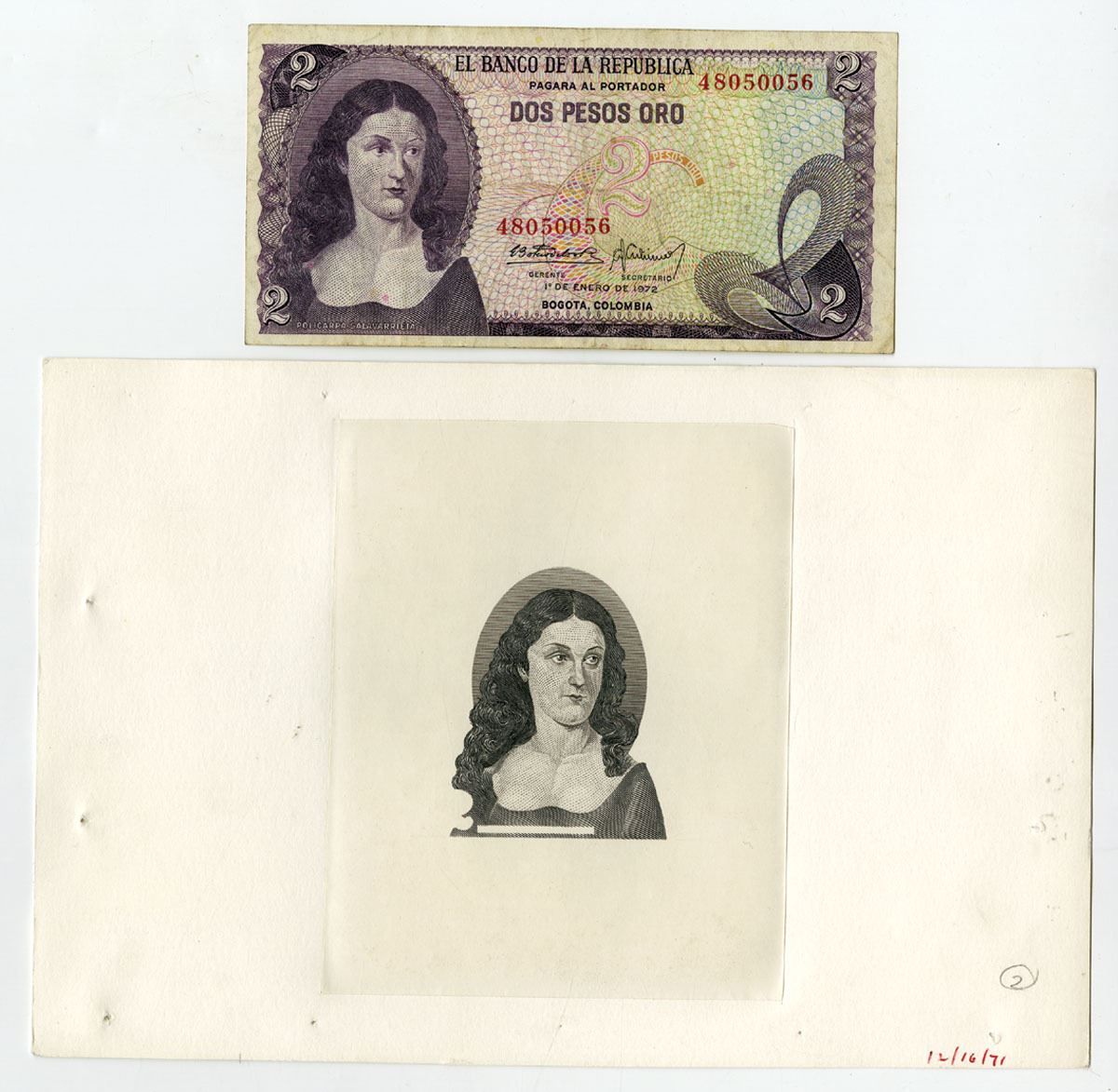 Bogota, Colombia, 1972. 2 Pesos Oro, P-413a, Issued Banknote, Purple on m/c underprint with portrait of Policarpa Salavarrieta at left, S/N 48050056. Lot also includes ABNC vignette of Policarpa Salavarrieta done in 1971. Policarpa Salavarrieta (c. 26 January 1795 – 14 November 1817), also known by her nickname of La Pola, was a Neogranadine seamstress who spied for the Revolutionary Forces during the Spanish Reconquista of the Viceroyalty of New Granada. She was captured by Spanish Royalists and ultimately executed for high treason. The Day of the Colombian Woman is commemorated on the anniversary of her death. She is now considered a heroine of the independence of Colombia. The issued banknote is in VF+ condition and the Large Die Proof Vignette dated "12-16-(19)71" is in CU condition. (2). Sold "AS IS" no returns accepted.