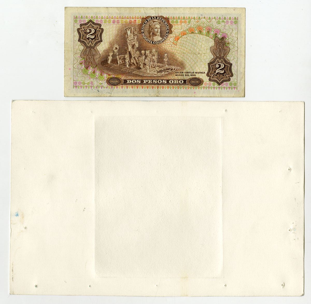 Bogota, Colombia, 1972. 2 Pesos Oro, P-413a, Issued Banknote, Purple on m/c underprint with portrait of Policarpa Salavarrieta at left, S/N 48050056. Lot also includes ABNC vignette of Policarpa Salavarrieta done in 1971. Policarpa Salavarrieta (c. 26 January 1795 – 14 November 1817), also known by her nickname of La Pola, was a Neogranadine seamstress who spied for the Revolutionary Forces during the Spanish Reconquista of the Viceroyalty of New Granada. She was captured by Spanish Royalists and ultimately executed for high treason. The Day of the Colombian Woman is commemorated on the anniversary of her death. She is now considered a heroine of the independence of Colombia. The issued banknote is in VF+ condition and the Large Die Proof Vignette dated "12-16-(19)71" is in CU condition. (2). Sold "AS IS" no returns accepted.