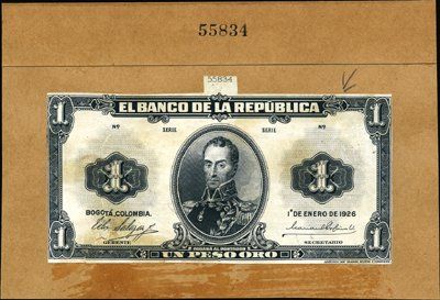 Colombia. ca.1870-1920's. 4 different banknote proofs; 3 different vignette proofs used on banknotes or other fiscal documents and 1 cigar label printed in 2 different sections on manila file folders in green. Banknote proofs include Vignette, text and title master proof in black for P-S551-553, L.1905 Series Proofs, El Banco Industrial; Vignette, text and title master proof in green for P-S429, El Banco Dugand; P-371, 1 Peso face proof in black and P-384, 1/2 peso back proof in black mounted on manila cards. vignettes include a LDP of the Statue of Bolivar monument for a Banco De Bogota vignette possibly used on banknote or other financial item and 2 different arms of Colombia with a Condor, engraved by ABNC and the other with an eagle by Continental BNC, both on india paper on manila card. A 2 section proof cigar label for Republica De Colombia, Departamento De Panama, Administracion General De Hacienda mounted on 2 different manila file folders in green ornately engraved is also present. Rare assortment of Colombia proofs. Unc. to Choice Unc. condition. ABNC, CBNC.