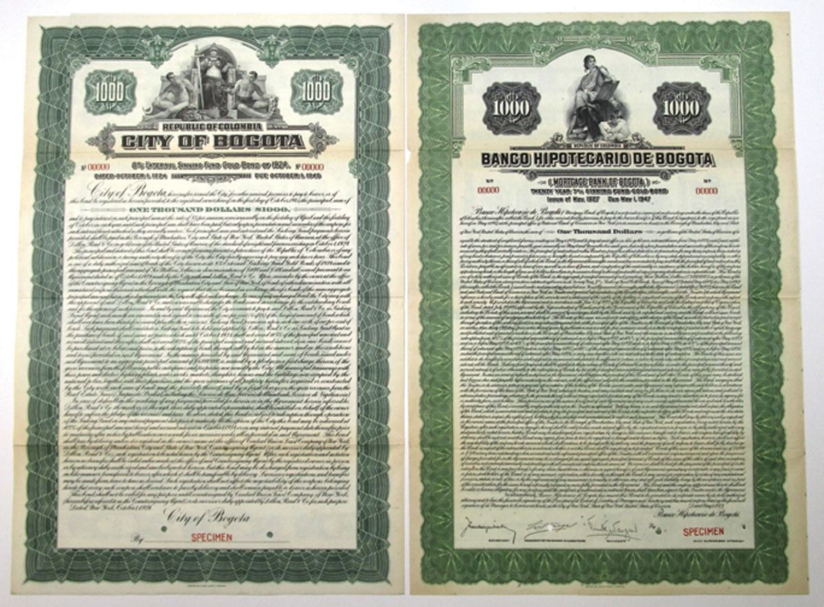 Colombia, 1924 and 27. Lot of 2 Specimen Bonds, includes:1924, City of Bogota, $1000 Specimen 8% External Sinking Fund Gold Coupon Bond in green; and, 1927, Banco Hipotecario de Bogota, $1000 Specimen 7% Sinking Fund Gold Coupon Bond in green. Both have red specimen overprints, 00000 serial numbers, and POCs. Fine-VF condition, with fragile fold lines and toning, ABNC. (2)
