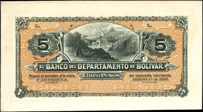 3-1-1888. P-S423. 5 Pesos. Cartagena, Colombia. Color trial front and back proofs with Orange undertinit & Orange back. Catalog value is pick is $500 in XF for issued note with overprint "Decerto?1895". Not known without overprint. Upper left corner of front proof bent in large margin not affecting note. Unique. Glue & mounting remnants on back. HBNC.
