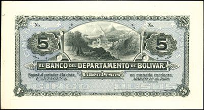 3-1-1888. P-S423. 5 Pesos. Proof. Cartagena, Colombia. Front and back proofs in issued colors possibly. Unique in archive. HBNC.