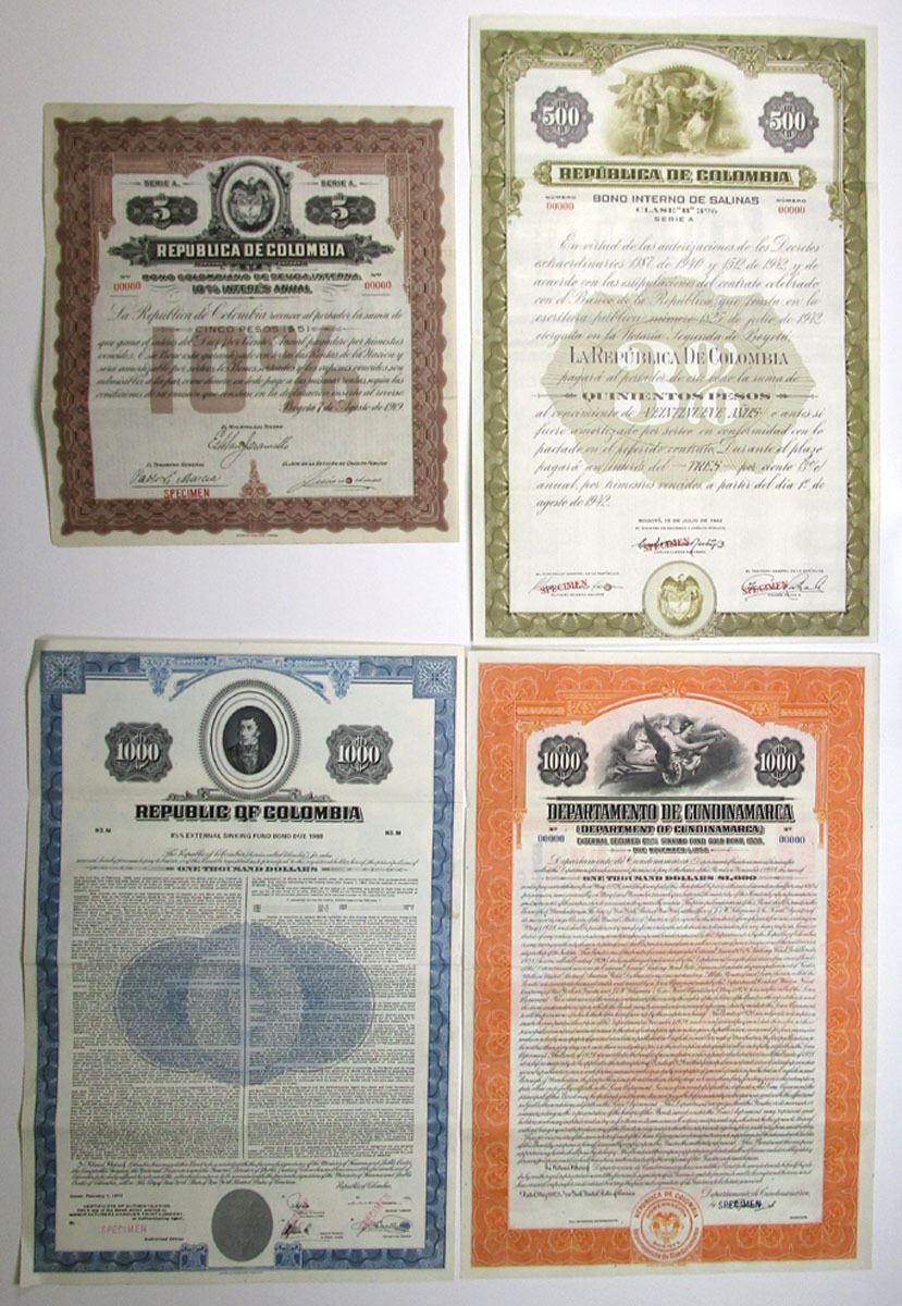 Colombia, 1919-78. Lot of 4 Specimen Bonds, Includes: Republica de Colombia 5 Pesos Coupon Bond, 1919; Department of Cundinamarca $1000 Coupon Bond, 1928; Republica de Colombia 500 Pesos Coupon Bond, 1942; Republic of Colombia $1000 Coupon Bond, 1973. All have Specimen overprints, POCs, and are in VF to XF+ condition. ABNC. (4). Sold "AS IS" no returns accepted.