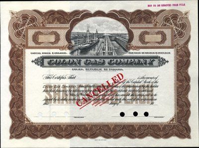 19--, ca.1900-1920. Odd Shs. Specimen stock certificate. Red specimen "Cancelled - Security Bank Note Co." overprints and POC's. Brown border. Unique vignette of ship in the Panama Canal Locks. XF condition. Unique in archive. SBNC.