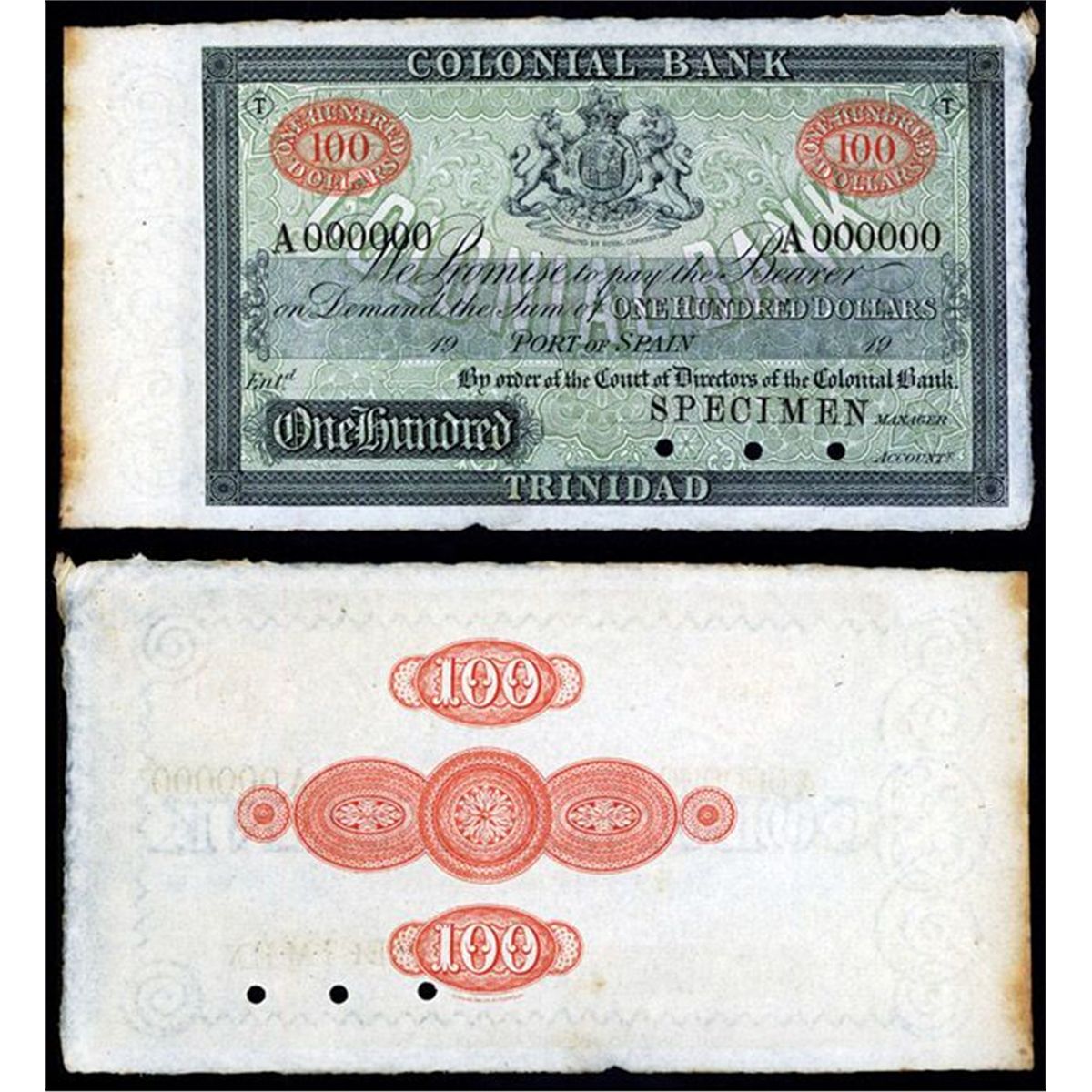 Port of Spain, Trinidad, Colonial Bank, 19xx (ca.1900-1910), £100, P-S134 Unlisted Specimen, “T” printed in top left and right corners for “Trinidad, large size Specimen by Perkins Bacon & Co., in green & black with red $100 counters, the back red, Specimen overprint, serial #A 000000, three small punch cancels, counterfoil on left, Listed only as proof in SCWPM and that was only partially printed without denominations or underprint, Excessively Rare. PBC.
